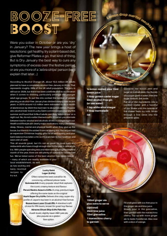 January 2026 | Phonebox Magazine 39Were you sober in October or are you %u2018dry%u2019 in January? The new year brings a host of resolutions: get healthy, try a plant-based diet, give Reformer Pilates a go, that kind of thing. But is Dry January the best way to cure any symptoms of excess over the festive period, or are you more of a %u2018zebra stripe%u2019 person (we%u2019ll explain that later%u2026)According to Alcohol Change UK, about 15.5 million UK adults planned to have a completely alcohol-free January in 2025. That represents roughly 29% of the UK adult population. The jury is still out on 2026, but there has been a defi nite shift to moderation when it comes to drinking, particularly amongst the younger adult age groups. To put this into context the number of people planning an alcohol-free January has climbed steeply over recent years: in 2019 around 4.2 million were estimated to do a month of abstinence; by 2024 this had risen to about 8.5 million. Popular zero alcohol beer brand Lucky Saint commissioned a survey this summer and found that 34% of adults said they %u2018zebra-stripe%u2019 on a night out. No, its not a safari themed outfi t. It%u2019s when you alternate between low/no-alcohol and alcoholic drinks in a single night out.Health and lifestyle are clearly major motivators: many cite better sleep, fi tness, mental and physical health when they give up the booze, but there is the added fi nancial saving too. You%u2019ve just had an expensive Christmas buying gifts for all and sundry, and your bank balance has taken a hit, so it%u2019s a win/win to feel healthier and save a bit of cash.This all sounds great, but it%u2019s not so great for local bars and restaurants who have a tough enough start to the year in January as it is. With people spending less and hibernating during the bleakest month of the year, there are still plenty of options for booze-free fun. We%u2019ve listed some of the best alcohol-free beers below %u2013 many of which are readily available in your local establishment, as well as two exciting and tasty mocktail recipes to try out. Booze-Free Boostlocal establishment, as well as two exciting and tasty mocktail recipes to try out. Lucky Saint Lager (0.5%): Often named the best overall for its convincing, unfi ltered pilsner taste.Guinness 0.0: A very popular stout that captures the iconic creamy texture and fl avour.Peroni Nastro Azzurro 0.0%: A crisp, premium lager off ering the same taste as the originalAsahi Super Dry 0.0%: Delivers the crisp, super-dry profi le of Japan's top beer in an alcohol-free format.Beavertown Lazer Crush IPA: A standout craft choice for IPA lovers, known for great hop fl avour.Adnams Ghost Ship 0.5% Pale Ale:A well-loved, slightly lower-ABV pale ale, also popular as a glutenfree option.Booze-Free Lemon drop martini mocktailShirleyTemple Mocktail%u00bd lemon zested, plus 15ml lemon juice1 tbsp golden caster sugar50ml alcohol-free gin(or use water)1 tsp white wine vinegar1 tbsp marmaladeiceCombine the lemon zest and sugar on a small plate. Dip the rim of a coupe glass in water, then the sugar mixture. Set aside.Put all of the ingredients into a cocktail shaker with a handful of ice. Shake until the outside of the shaker feels icy cold. Strain through a fine sieve into the prepared glass.ice150ml ginger aleplus extra to serve (optional)25ml lime juice15ml grenadine1 maraschino cherryto garnishFill a tall glass with ice, then pour in the ginger ale and lime juice.Slowly pour in the grenadine, then garnish with the maraschino cherry. Top up with more ginger ale to taste if preferred. Also nice with a slice of orange.
