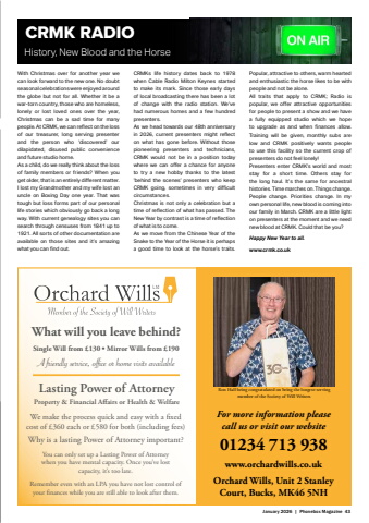 January 2026 | Phonebox Magazine 43We make the process quick and easy with a fixed cost of %u00a3360 each or %u00a3580 for both (including fees)Why is a lasting Power of Attorney important?You can only set up a Lasting Power of Attorney when you have mental capacity. Once you%u2019ve lost capacity, it%u2019s too late.Remember even with an LPA you have not lost control of your finances while you are still able to look after them.For more information pleasecall us or visit our website01234 713 938www.orchardwills.co.ukOrchard Wills, Unit 2 Stanley Court, Bucks, MK46 5NHLasting Power of AttorneyProperty & Financial Affairs or Health & WelfareWhat will you leave behind?Single Will from %u00a3130 %u2022 Mirror Wills from %u00a3190A friendly service, office or home visits availableRon Hall being congratulated on being the longest-serving member of the Society of Will WritersWith Christmas over for another year we can look forward to the new one. No doubt seasonal celebrations were enjoyed around the globe but not for all. Whether it be a war-torn country, those who are homeless, lonely or lost loved ones over the year, Christmas can be a sad time for many people. At CRMK, we can refl ect on the loss of our treasurer, long serving presenter and the person who %u2018discovered%u2019 our dilapidated, disused public convenience and future studio home.As a child, do we really think about the loss of family members or friends? When you get older, that is an entirely diff erent matter. I lost my Grandmother and my wife lost an uncle on Boxing Day one year. That was tough but loss forms part of our personal life stories which obviously go back a long way. With current genealogy sites you can search through censuses from 1841 up to 1921. All sorts of other documentation are available on those sites and it%u2019s amazing what you can fi nd out.CRMKs life history dates back to 1978 when Cable Radio Milton Keynes started to make its mark. Since those early days of local broadcasting there has been a lot of change with the radio station. We%u2019ve had numerous homes and a few hundred presenters. As we head towards our 48th anniversary in 2026, current presenters might refl ect on what has gone before. Without those pioneering presenters and technicians, CRMK would not be in a position today where we can off er a chance for anyone to try a new hobby thanks to the latest %u2018behind the scenes%u2019 presenters who keep CRMK going, sometimes in very diffi cult circumstances. Christmas is not only a celebration but a time of refl ection of what has passed. The New Year by contrast is a time of refl ection of what is to come. As we move from the Chinese Year of the Snake to the Year of the Horse it is perhaps a good time to look at the horse%u2019s traits. Popular, attractive to others, warm hearted and enthusiastic the horse likes to be with people and not be alone. All traits that apply to CRMK; Radio is popular, we off er attractive opportunities for people to present a show and we have a fully equipped studio which we hope to upgrade as and when fi nances allow. Training will be given, monthly subs are low and CRMK positively wants people to use this facility so the current crop of presenters do not feel lonely! Presenters enter CRMK%u2019s world and most stay for a short time. Others stay for the long haul. It%u2019s the same for ancestral histories. Time marches on. Things change. People change. Priorities change. In my own personal life, new blood is coming into our family in March. CRMK are a little light on presenters at the moment and we need new blood at CRMK. Could that be you?Happy New Year to all.www.crmk.co.ukHistory, New Blood and the HorseCRMK RADIO
