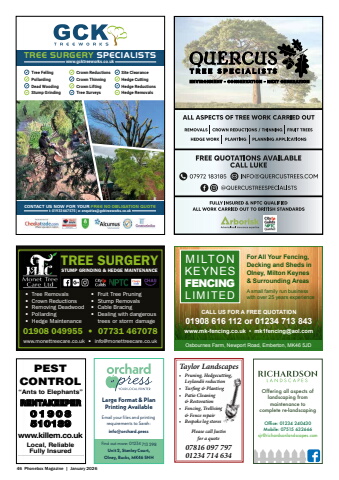 46 Phonebox Magazine | January 2026CALL US FOR A FREE QUOTATION 01908 616 112 or 01234 713 843 www.mk-fencing.co.uk %u2022 mk1fencing@aol.comMILTONKEYNESFENCINGLIMITEDOsbournes Farm, Newport Road, Emberton, MK46 5JDFor All Your Fencing, Decking and Sheds in Olney, Milton Keynes & Surrounding Areas A small family run business with over 25 years experience%u2022 Pruning, Hedgecutting, Leylandii reduction%u2022 Turfi ng & Planting%u2022 Patio Cleaning & Restoration%u2022 Fencing, Trellising & Fence repair%u2022 Bespoke log storesTaylor LandscapesPlease call Justin for a quote07816 097 79701234 714 634Leylandii reduction%u2022 Turfi ng & Planting%u2022 Fencing, Trellising TREE SURGERYSTUMP GRINDING & HEDGE MAINTENANCE01908 049955 %u2022 07731 467078www.monettreecare.co.uk %u2022 info@monettreecare.co.uk%u2022 Tree Removals%u2022 Crown Reductions%u2022 Removing Deadwood%u2022 Pollarding%u2022 Hedge Maintenance%u2022 Fruit Tree Pruning%u2022 Stump Removals%u2022 Cable Bracing%u2022 Dealing with dangeroustrees or storm damageOffering all aspects of landscaping from maintenance to complete re-landscapingOffice: 01234 240430 Mobile: 07515 632666sjr@richardsonlandscapes.comPESTCONTROL %u201cAnts to Elephants%u201dRENTAKEEPER01 90 8510189www.killem.co.ukLocal, ReliableFully InsuredTree Surgery SpecialistsWe provide professional tree care, landscaping and fencing services, in accordance with the rigorous standards laid out by the Arboricultural Association.For more information call: 01933 667575Email: enquiries@gcktreeworks.co.ukFREEquotes%u2022 Tree Felling%u2022 Pollarding%u2022 Dead Wooding%u2022 Stump Grinding%u2022 Crown Reductions%u2022 Crown Thinning%u2022 Crown Lifting%u2022 Tree Surveys%u2022 Site Clearence%u2022 Hedge Cutting%u2022 Hedge Reductions%u2022 Hedge RemovalsGCK Domestic leaflet A5.indd 1 14/08/2018 10:42TREE SURGERY SPECIALISTS www.gcktreeworks.co.ukTree FellingPollardingDead WoodingStump GrindingCrown ReductionsCrown ThinningCrown LiftingTree SurveysSite ClearanceHedge CuttingHedge ReductionsHedge RemovalsCONTACT US NOW FOR YOUR FREE NO OBLIGATION QUOTEt: 01933 667575 | e: enquiries@gcktreeworks.co.ukFind out more: 01234 713 298 Unit 2, Stanley Court, Olney, Bucks, MK46 5NHLarge Format & Plan Printing AvailableEmail your fi les and printing requirements to Sarah:info@orchard.press
