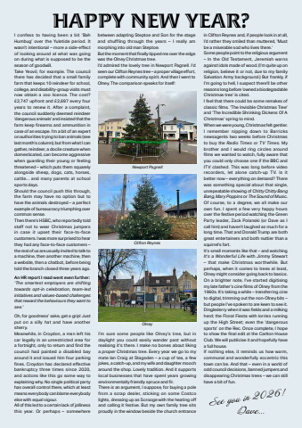 50 Phonebox Magazine | January 2026See you in 2026!Dave%u2026 HAPPY NEW YEAR?I confess to having been a bit %u2018Bah Humbug%u2019 over the Yuletide period. It wasn%u2019t intentional %u2013 more a side-eff ect of looking around at what was going on during what is supposed to be the season of goodwill.Take Yeovil, for example. The council there has decided that a small family farm that keeps 10 reindeer for school, college, and disability-group visits must now obtain a zoo licence. The cost? %u00a32,747 upfront and %u00a32,697 every four years to renew it. After a complaint, the council suddenly deemed reindeer %u2018dangerous animals%u2019 and insisted that the farm keep fi rearms and ammunition in case of an escape. I%u2019m a bit of an expert on authorities trying to ban animals (see last month%u2019s column), but from what I can gather, reindeer, a docile creature when domesticated, can become aggressive when guarding their young or feeling threatened %u2013 which puts them squarely alongside sheep, dogs, cats, horses, cattle%u2026 and many parents at school sports days.Should the council push this through, the farm may have no option but to have the animals destroyed %u2013 a perfect example of bureaucracy triumphing over common sense.Then there%u2019s HSBC, who reportedly told staff not to wear Christmas jumpers in case it upset their face-to-face customers. I was more surprised to hear they had any face-to-face customers %u2013 the rest of us are usually invited to talk to a machine, then another machine, then a website, then a chatbot, before being told the branch closed three years ago.An HR report I read went even further:%u2018The smartest employers are shifting towards opt-in celebration, team-led initiatives and values-based challenges that reward the behaviours they want to see.%u2019Oh, for goodness%u2019 sake, get a grip! Just put on a silly hat and have another sherry.Meanwhile, in Croydon, a man left his car legally in an unrestricted area for a fortnight, only to return and fi nd the council had painted a disabled bay around it and issued him four parking fi nes. Croydon has declared eff ective bankruptcy three times since 2020, and actions like this go some way to explaining why. No single political party has overall control there, which at least means everybody can blame everybody else with equal vigour.All of this led to a certain lack of jolliness this year. Or perhaps %u2013 somewhere Newport PagnellClifton ReynesOlneyI%u2019m sure some people like Olney%u2019s tree, but in daylight you could easily wander past without realising it%u2019s there. I make no bones about liking a proper Christmas tree. Every year we go to my mate Ian Craig at Stagsden %u2013 a cup of tea, a few jokes, a catch-up, and my wife and daughter mooch around the shop. Lovely tradition. And it supports local businesses that have spent years growing environmentally friendly spruce and fi r.There is an argument, I suppose, for buying a pole from a scrap dealer, sticking on some Costco lights, dressing up as Scrooge with the heating off and calling it festive. But my own family tree sits proudly in the window beside the church entrance between adapting Steptoe and Son for the stage and shuffling through the years %u2013 I really am morphing into old man Steptoe.But the moment that fi nally tipped me over the edge was the Olney Christmas tree.I%u2019d admired the lovely tree in Newport Pagnell. I%u2019d seen our Clifton Reynes tree %u2013 a proper village eff ort, complete with community spirit. And then I went to Olney. The comparison speaks for itself:in Clifton Reynes and, if people look in at all, I%u2019d rather they smiled than muttered, %u2018Must be a miserable sod who lives there.%u2019Some people point to the religious argument %u2013 In the Old Testament, Jeremiah warns against idols made of wood. (I%u2019m quite up on religion, believe it or not, due to my family Salvation Army background.) But frankly, if I%u2019m going to hell, I suspect there%u2019ll be other reasons long before %u2018owned a biodegradable Christmas tree%u2019 is cited.I feel that there could be some remakes of classic fi lms. %u2018The Invisible Christmas Tree%u2019 and %u2018The Incredible Shrinking Dickens Of A Christmas%u2019 spring to mind.When we were young, Christmas felt gentler. I remember nipping down to Barricks newsagents two weeks before Christmas to buy the Radio Times or TV Times. My brother and I would ring circles around fi lms we wanted to watch, fully aware that you could only choose one if the BBC and ITV clashed. This was long before video recorders, let alone catch-up TV. Is it better now %u2013 everything on demand? There was something special about that single, unrepeatable showing of Chitty Chitty Bang Bang, Mary Poppins or The Sound of Music.Of course, to a degree, we all make our own fun. I spent a few very happy hours over the festive period watching the Green Party leader, Zack Polanski (or Dave as I call him) and haven%u2019t laughed as much for a long time. That and Donald Trump are both great entertainers and both nuttier than a squirrel%u2019s fart.It%u2019s small moments like that %u2013 and watching It%u2019s a Wonderful Life with Jimmy Stewart %u2013 that make Christmas worthwhile. But perhaps, when it comes to trees at least, Olney might consider going back to basics.On a brighter note, I%u2019ve started digitising my late father%u2019s cine fi lms of Olney from the 1960s. It%u2019s taking a while %u2013 transferring cine to digital, trimming out the non-Olney bits %u2013 but people I%u2019ve spoken to are keen to see it. Dinglederry when it was fi elds and a milking herd; the Floral Fiesta with lorries running up the High Street; even the %u2018dangerous sports%u2019 on the Rec. Once complete, I hope to show the fi nal edit at the Carlton House Club. We will publicise it and hopefully have a full house.If nothing else, it reminds us how warm, communal and wonderfully eccentric t