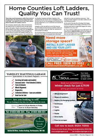 January 2026 | Phonebox Magazine 51Your local, independent Service, MOT & repair centrewww.soulgarages.co.uk service@soulgarages.co.ukFind us on Lime Street, Olney, Buckinghamshire MK46 5BABook our comprehensiveWinter check for just %u00a379.99 giving you peace of mindIncludesFREEIce ScraperCall now to book: 01234 712592%u2714 Wheel alignment %u2714 Wipers & washers%u2714 Battery & charging system%u2714 Antifreeze%u2714 Tyres %u2714 Lights%u2714 Fluids%u2714 Drive belts%u2714 Free ice scraperYARDLEY HASTINGS GARAGESpecialists in Accident RepairsServicing (all makes and models)Insurance work %u2013 Free Estimates & AdviceTyres & ExhaustsWheel Alignment DiagnosticsCollection & Delivery %u2013 Loan cars availableUsed Cars for SaleAre you looking to sell? We are looking to buy late, low mileage cars for stock.8am to 5.30 pm Monday to Friday8 am to 12.30 pm SaturdayOpeningTimesTel 01604 696 225 Fax 01604 696 551Bedford Rd West, Yardley Hastings, Northampton, NN7 1HBTraditionalFriendly Service C%u2022 Loft Ladders %u2022 Hatches %u2022 Boarding %u2022 Insulation %u2022 Lights %u2022 Fully GuaranteedSTARTER PACKAGE: Aluminium loft ladder, light plus 50 sqft boarding, fully fitted in less than a day from %u00a3355Need more storage space?STARTER PACKAGE Aluminium loft INSTALL A LOFT LADDER AND USE YOUR LOFT!CALL FREE: 0808 301 9552These days most homeowners suffer from a lack of storage space. So many precious items that need to be kept %u2013 but where to store it all? That%u2019s where Home Counties Loft Ladders come in. The company, based locally, offers homeowners the opportunity to maximise their storage space with a loft ladder, 50sqft of boarding and a light - all fully fitted in less than a day from just %u00a3444! But it%u2019s not just the affordability of the package that makes Home Counties Loft Ladders stand out, as manager Jamie Oakley explains: %u2018Our watchwords are Quality, Integrity and Value. Quality in the materials that we use for all our installations and the fact that all our loft packages are fitted by time served tradesmen, so our customers are assured of the best job. Integrity in that we will turn up at the time we say and make sure the house is spotless when we leave, and value in that we offer our services at a price people can afford. Our business relies on referrals and we get a huge amount of our calls from people who have been referred to us by our existing customers - that simply wouldn%u2019t happen if we didn%u2019t adhere to our overriding principles. At the end of the day the old adage that happy customers lead to more happy customers is true and we work hard to make that happen for every installation we carry out!%u2019 So, if you want to make use of your loft space, call Jamie free on 0808 301 9552 and he%u2019ll be happy to pop round and give you a no obligation quote so you too can make use of your loft!Home Counties Loft Ladders, Quality You Can Trust!%u00a3444