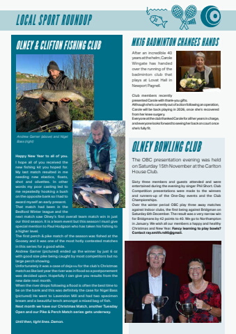54 Phonebox Magazine | January 2026LOCAL SPORT ROUNDUPOLNEY & CLIFTON FISHING CLUBHappy New Year to all of you.I hope all of you received the new fishing kit you hoped for. My last match resulted in me needing new elastics, floats, shot and olivettes. In other words my poor casting led to me repeatedly hooking a bush on the opposite bank so I had to award myself an early present. That match had been in the Bedford Winter league and the next match saw Olney%u2019s first overall team match win in just our third season. It is a team event but this season I must give special mention to Paul Hodgson who has taken his fishing to a higher level.The first perch & pike match of the season was fished at the Goosey and it was one of the most hotly contested matches in this series for a good while. Andrew Garner (pictured) ended up the winner by just 6 oz with good size pike being caught by most competitors but no large perch showing.Unfortunately it was a case of deja vu for the club%u2019s Christmas match as like last year the river was in flood so a postponement was decided upon. Hopefully I can give you results from the new date next month. When the river drops following a flood is often the best time to be on the bank and this was definitely the case for Nigel Bass (pictured) He went to Lavendon Mill and had two specimen bream and a beautiful tench amongst a mixed bag of fish.Next month we have our Christmas Match, another Tuesday Open and our Pike & Perch Match series gets underway.Until then, tight lines. Damon.After an incredible 40 years at the helm, Carole Wingate has handed over the running of the badminton club that plays at Lovat Hall in Newport Pagnell.Club members recently presented Carole with thank-you gifts.Although she%u2019s currently out of action following an operation, Carole will be back playing in 2026, once she%u2019s recovered from her knee surgery.Everyone at the club thanked Carole for all her years in charge, and everyone looks forward to seeing her back on court once she%u2019s fully fi t.The OBC presentation evening was held on Saturday 15th November at the Carlton House Club.Sixty three members and guests attended and were entertained during the evening by singer Phil Short. Club Competition presentations were made to the winners and runners-up of the One-Day events and the Club Championships.Over the winter period OBC play three away matches against Indoor clubs, the fi rst being against Bridgman on Saturday 6th December. The result was a very narrow win for Bridgmans by 42 points to 40. We go to Northampton in January. We wish all our members a happy and healthy Christmas and New Year. Fancy learning to play bowls? Contact ray.smith.rs95@gmail.OLNEY BOWLING CLUBMK16 BADMINTON CHANGES HANDSAndrew Garner (above) and Nigel Bass (right)