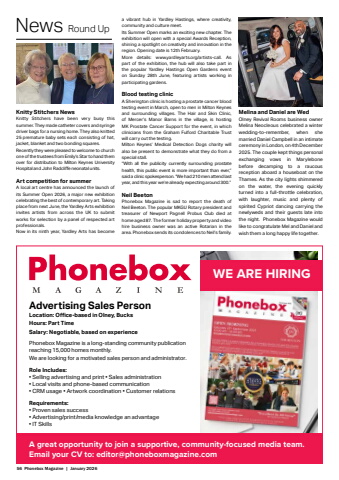 56 Phonebox Magazine | January 2026Knitty Stitchers NewsKnitty Stitchers have been very busy this summer. They made catheter covers and syringe driver bags for a nursing home. They also knitted 25 premature baby sets each consisting of hat, jacket, blanket and two bonding squares. Recently they were pleased to welcome to church one of the trustees from Emily%u2019s Star to hand them over for distribution to Milton Keynes University Hospital and John Radcliff e neonatal units. Art competition for summerA local art centre has announced the launch of its Summer Open 2026, a major new exhibition celebrating the best of contemporary art. Taking place from next June, the Yardley Arts exhibition invites artists from across the UK to submit works for selection by a panel of respected art professionals. Now in its ninth year, Yardley Arts has become News Round Upa vibrant hub in Yardley Hastings, where creativity, community and culture meet. Its Summer Open marks an exciting new chapter. The exhibition will open with a special Awards Reception, shining a spotlight on creativity and innovation in the region. Opening date is 12th February. More details: www.yardleyarts.org/artists-call. As part of the exhibition, the hub will also take part in the popular Yardley Hastings Open Gardens event on Sunday 28th June, featuring artists working in participating gardens.Blood testing clinicA Sherington clinic is hosting a prostate cancer blood testing event in March, open to men in Milton Keynes and surrounding villages. The Hair and Skin Clinic, of Mercer%u2019s Manor Barns in the village, is hosting MK Prostate Cancer Support for the event, in which clinicians from the Graham Fulford Charitable Trust will carry out the testing.Milton Keynes%u2019 Medical Detection Dogs charity will also be present to demonstrate what they do from a special stall.%u201cWith all the publicity currently surrounding prostate health, this public event is more important than ever,%u201d said a clinic spokesperson. %u201cWe had 210 men attend last year, and this year we%u2019re already expecting around 300.%u201dNeil BeetonPhonebox Magazine is sad to report the death of Neil Beeton. The popular MKGU Rotary president and treasurer of Newport Pagnell Probus Club died at home aged 87. The former holiday property and video hire business owner was an active Rotarian in the area. Phonebox sends its condolences to Neil%u2019s family.Melina and Daniel are WedOlney Revival Rooms business owner Melina Neocleous celebrated a winter wedding-to-remember, when she married Daniel Campbell in an intimate ceremony in London, on 4th December 2025. The couple kept things personal exchanging vows in Marylebone before decamping to a raucous reception aboard a houseboat on the Thames. As the city lights shimmered on the water, the evening quickly turned into a full-throttle celebration, with laughter, music and plenty of spirited Cypriot dancing carrying the newlyweds and their guests late into the night. Phonebox Magazine would like to congratulate Mel and Daniel and wish them a long happy life together.Advertising Sales PersonLocation: Offi ce-based in Olney, BucksHours: Part TimeSalary: Negotiable, based on experiencePhonebox Magazine is a long-standing community publication reaching 15,000 homes monthly. We are looking for a motivated sales person and administrator.Role Includes:%u2022 Selling advertising and print %u2022 Sales administration %u2022 Local visits and phone-based communication %u2022 CRM usage %u2022 Artwork coordination %u2022 Customer relationsA great opportunity to join a supportive, community-focused media team.Email your CV to: editor@phoneboxmagazine.comWE ARE HIRINGRequirements:%u2022 Proven sales success %u2022 Advertising/print/media knowledge an advantage %u2022 IT Skills