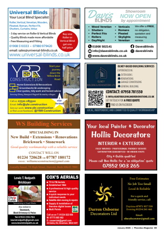 January 2026 | Phonebox Magazine 59WS Building ServicesSPECIALISING INNew Build %u2022 Extensions %u2022 RenovationsBrickwork %u2022 StoneworkGood quality workmanship with a reliable serviceCONTACT WILL ON01234 720628 OR 07787 180172email: williamcsconstruction@gmail.comLocally based, 74 High Street, Harrold, Beds MK43 7BHDarren OsborneDecorators LtdFree EstimatesNo Job Too SmallLocal & ReliableFor a quick and friendly service, callDaytime 07971 937 539Evening 01234 241 461Email: olneydecorator@gmail.comHollis DecoratorsEXPERIENCED IN: EXTENSIONSRENOVATIONS GARAGE CONVERSIONS GENERAL BUILDERCONTACT: 07958 781550 E: INFO@OLNEYBUILDINGANDRENOVATIONS.CO.UKGET IN TOUCH FOR A FREE QUOTE FIND US ON FACEBOOKLOCAL, INDEPENDENT, AND COMMITTED TO QUALITY WORKMANSHIPINGCOX%u2019S AERIALS%u25cf TV & FM Aerials%u25cf Established 1964%u25cf A professional & high qualityservice%u25cf A quick response to yourindividual needs%u25cf Satellite dish moving & repairs%u25cf Supply & installation offreeview digital boxes%u25cf Multi PointsCall us on T: 01234 822 006M: 07974 933 526E: coxaerials@gmail.com28 Oakley Rd, Bromham, MK43 8HYCall us on T: 01234 822 006M: 07775 985 662E: coxaerials@gmail.com28 Oakley Rd, Bromham, MK43 8HYShowroom NOW OPENby appointment%u2022 Wood Venetian%u2022 Shutters%u2022 Perfect Fits%u2022 Rollers%u2022 Day/Night01908 502141info@davesblinds.co.ukwww.davesblinds.co.ukDavesBlindsdavesblinds%u2022 Verticals%u2022 Romans%u2022 Pleated%u2022 Skylights%u2022 VenetianWe offer a FREE, no obligation, quotation and measuring service.%u2019Also skilled in stonework, block driveways and patios. Specialising in small works.Tel 07833 991784 Email lewistredpath@gmail.comQualified Web www.lewistredpath.co.ukTel 07833 991784 lewistredpath@gmail.com www.lewistredpath.co.ukLewis T. Redpath BricklayerSpecialising in Small WorksAlso skilled inStonework, Block Driveways & Patios Home Extensions & Renovations Groundworks & Landscaping Clear quotes, tidy work and honest adviceServing Olney, Newport Pagnell & nearby villagesCall us: 07521 285910Email: info@ybr.constructionSee our work: www.ybr.constructionor find us on facebook: @YBR-ConstructionStart your journey down the Yellow Brick Road5 starreviewsUniversal BlindsYour Local Blind SpecialistRoller, Vertical, Venetian, Wooden, Pleated, Roman, Perfect Fit, Shutters, Curtains, Velux%u2022 3 day service on Roller & Vertical Blinds%u2022 Quality Blinds made more affordable%u2022 Free Measuring and Fitting01908 510333 %u2022 07980 979420email: sales@universal-blinds.co.ukwww.universal-blinds.co.ukBuy one Roller or Vertical Blind get one half price