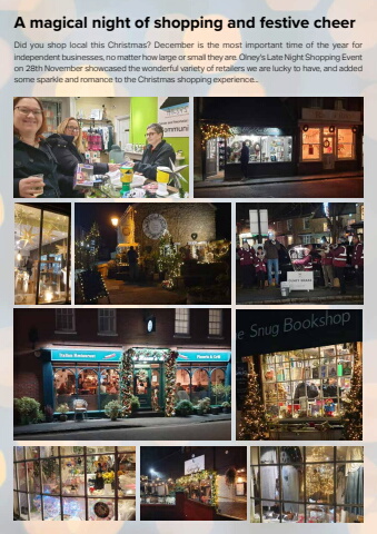 6 Phonebox Magazine | January 2026A magical night of shopping and festive cheerDid you shop local this Christmas? December is the most important time of the year for independent businesses, no matter how large or small they are. Olney's Late Night Shopping Event on 28th November showcased the wonderful variety of retailers we are lucky to have, and added some sparkle and romance to the Christmas shopping experience...