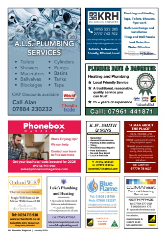 60 Phonebox Magazine | January 2026info@bluefl amemk.co.ukwww.bluefl amemk.co.ukTel: 01908 216769Mob: 07860 332287PLUMBING AND HEATING ENGINEERSBREAKDOWNS AND INSTALLATIONSCONTACT US NOW FOR A QUOTE 33089A.L.S. PLUMBING SERVICESCall Alan07884 230232OAP Discounts available%u2022 Toilets%u2022 Showers%u2022 Macerators%u2022 Ballvalves%u2022 Blockages%u2022 Cylinders%u2022 Pumps%u2022 Basins%u2022 Tanks%u2022 TapsCentral Heating ServicesCLIMAheat192093KEITH PRYCEM: 07764 577 292T: 01234 241 172E: kpryce@climaheat.co.ukInstallation, maintenance &repairs on all Gas appliances%u25c6 Specialist in Bathroom & Wetroom refurbishments%u25c6 Local and Reliable%u25c6 Free Quotation for all jobsLuke%u2019s Plumbing and Heatinglukesplumbingmk@gmail.comwww.lukesplumbing.co.ukCall 07595 475565%u00ab Local Friendly Service%u00ab A traditional, reasonable, quality service you can trust%u00ab 25 + years of experienceCall: 07961 441871Vulcanhall ltd PLUMBER DAVE & DAUGHTERHeating and Plumbing01933 322 28307717 742 702Plumbing and HeatingBathroom Design andInstallationTiling and Wall PanelsLeak DetectionWater FiltrationTaps, Toilets, Showers,Pipe workReliable, Professional,Friendly, Efficient, Localinfo@krhplumbingservices.co.ukwww.krhplumbingservices.co.ukWhat will you leave behind?Single Will from %u00a3120Mirror Wills from %u00a3180 A friendly service, office or home visits availableTel: 01234 713 938www.orchardwills.co.ukOrchard Wills, Unit 2, Stanley Court, Olney, Bucks, MK46 5NHLOCAL, RELIABLE, AND COMPETITIVELY PRICED HELP Internal: painting and decorating,tiling and general repairsExternal: general maintenance, hedge trimming, turfing, fencing, sheds and pavingDomestic and commercial, fully insured, free estimates and advice.%u201cA MAN ABOUT THE PLACE%u201dcall Geoff on:07770 781627K .W . SMITH& SONS%u2022 Carpentry %u2022 General Maintenance%u2022 Painting & Decorating%u2022 Tiling%u2022 Miscellaneous Repairs%u2022 Free Estimates%u2022 No Job Too Small%u2022 Local & ReliableT: 01234 959162M: 07513 129124kwsmith57@hotmail.comGet your business leads boosted for 202601234 713 298 sales@phoneboxmagazine.comWork Drying Up?We can helpContact our team to find out more