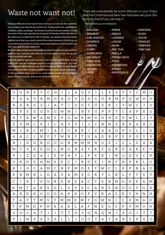 62 Phonebox Magazine | January 2026There will undoubtedly be some leftovers in your fridge after the Christmas and New Year festivities are gone. But don%u2019t bin them if you can help it.O G B E Y C H I L A Q U I L E S V T L M OF X A V B N D X O V D D S O R M P Q W H DR D B U Z J A Y I U O T O E K J Y W C J UL P E S O V G W M I B Y U P P Y C A P X GB T K W A M E P G W K M D D H E P W L J YE S M L E I L A S V J J C N N Z R K A B CM J K C M I A S O R P J Z A A O P C L I UA A C J N F T W R F T U A G R P E P G Y RB I D G R O O G R W M N N O E J C L D A RM T S A D D L N U B X Y K F Q B E A R E YP I Z Z A I E H H T L P E K I N G D U C KU B D S H M S E C I R D E I R F A P K L OB I G C A M C B P M D E Y W C L X P B A DX B M R L G A S A M S O K Y L B L F T S YC I X I O G R E R E A C T E B M G D E A MK M T A K S G L U S S C A H Z W U G Y G XA B D H U U O A P X O P V R A Z K Y H N HT A F T M S T M M E M F G W H I C X M A OT P M D P H K A E L A F N E O S P Y M O HS O C A T I I T T O S Q N Q N J E O J T TP L W P G Z E L L I U O T A T A R Z P X G%ufffd BAKLAVA%ufffd BIBIMBAP%ufffd CHILAQUILES %ufffd CHURROS%ufffd CREPES%ufffd CURRY%ufffd DUMPLINGS%ufffd ESCARGOT%ufffd FRIED RICE%ufffd GAZPACHO%ufffd GELATO%ufffd JEONWaste not want not!Using up leftovers is the right choice. Doing so is not only less wasteful, but it makes your pennies go further too. Turkey, beef, ham, vegetables, cheeses, cakes, puddings: the festive food list is almost endless. These are some of the main ingredients of a great Christmas or New Year dinner. But when you%u2019re catering for lots of people, you always have to prepare slightly more than you need, to avoid the embarrassment of running out of something. And that of course, means there will be some food left over after your guests have departed. But that%u2019s OK. Using excess food and ingredients means at least another meal for you %u2013 served cold, warmed up thoroughly or even cut up and used in a whole new dish.And with money tight and a general wish for less waste in the world, now is the time to investigate ways to use up your leftovers. Turn last night%u2019s dinner into today%u2019s lunch. And, moving into 2026, try to dedicate one night every week to using up leftovers from your fridge or freezer.In the meantime, have a go at our word search puzzle which contains some of your favourite dishes from around the world.Here%u2019s what you are looking for:%ufffd KEBAB%ufffd KIMCHI%ufffd LASAGNA%ufffd LOKUM%ufffd NAAN%ufffd PAD THAI%ufffd PAELLA%ufffd PEKING DUCK%ufffd PIZZA%ufffd POPIAH TOD%ufffd RAMEN%ufffd RATATOUILLE%ufffd SAMOSAS%ufffd SUSHI%ufffd TACOS%ufffd TAMALES%ufffd TEMPURA%ufffd TOM YUM