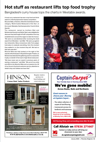 January 2026 | Phonebox Magazine 63%u2022 The widest collection of carpets & hard %u000c ooring%u2022 Commercial services for landlords and businessesWe%u2019re now exclusively based out of our workshop at Wharley Farm, MK43 0AHCall Alistair on 07836 271667We%u2019ve gone mobile!Across Bucks, Beds and Northantsal.captaincarpet@gmail.comContact us today and we will bring our showroom to your doorGreat reasons to choose your %u0012 ooring at Captain Carpet...Still %u00a0 ooring Olney and surrounding areas after 36 yearsPAS 24 compliant for new builds and barn conversionsTo book an appointment to visit our workshop, pleasephone 01908 516333 or email info@hinsoncustommade.co.ukWorkshop 2, Spinney Lodge Farm, Forest Road, Hanslope, MK19 7DEWWW.HINSONCUSTOMMADE.CO.UKBespoke windows and doors for listed buildings and conservation areasManufacturer of Wooden Windows & DoorsAs seen at%u2022 The widest collection of carpets & hard %u000c ooring%u2022 Commercial services for landlords and businessesWe%u2019re now exclusively based out of our workshop at Wharley Farm, MK43 0AHCall Alistair on 07836 271667We%u2019ve gone mobile!Across Bucks, Beds and Northantsal.captaincarpet@gmail.comContact us today and we will bring our showroom to your doorGreat reasons to choose your %u0012 ooring at Captain Carpet...Still %u00a0 ooring Olney and surrounding areas after 36 yearsPAS 24 compliant for new builds and barn conversionsTo book an appointment to visit our workshop, pleasephone 01908 516333 or email info@hinsoncustommade.co.ukWorkshop 2, Spinney Lodge Farm, Forest Road, Hanslope, MK19 7DEWWW.HINSONCUSTOMMADE.CO.UKBespoke windows and doors for listed buildings and conservation areasManufacturer of Wooden Windows & DoorsAs seen atHot stufi as restaurant lifts top food trophyBangladeshi curry house tops the charts in Weetabix awards.A local curry restaurant has won a top food and drink award in a Northamptonshire-based competition.Mooche Wala, of Denton, lifted the Gold Award in their category, %u2018World Cuisine Restaurant of the Year%u2019, at the recent Weetabix Northamptonshire Food & Drink Awards.The restaurant, owned by brothers Bilal and Mohammed Hussain and father Nazir, were delighted to discover they had fought off stiff competiton from top establishments around the region to take the honour.%u201cWe were so overwhelmed after receiving the Gold award from Weetabix,%u201d said Bilal. %u201cWe were up against top restaurants. Many anonymous visits from judges took place to evaluate everything, from the moment they walked in, to the moment they left. We had no idea who was who.%u201dMooche Wala was fully booked on the night of the awards at Northampton%u2019s Royal & Derngate Theatre, so Mohammed attended the glittering event to receive the trophy on behalf of the town%u2019s High Street restaurant.%u201cWe have never won an award in previous years of owning a restaurant,%u201d said Bilal. %u201cWe put all our pride and eff orts into Mooche Wala and our passion too. All of our focus is food and customer service, attention to detail is key and I believe we have that.%u201d