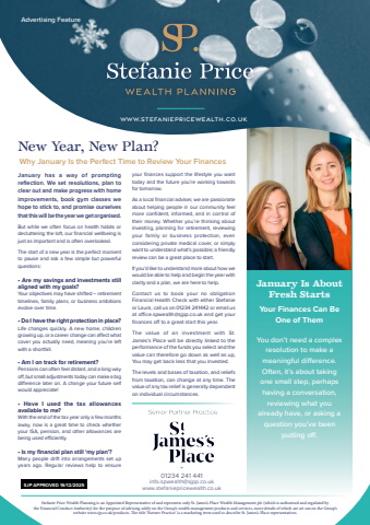 January 2026 | Phonebox Magazine 9January has a way of prompting reflection. We set resolutions, plan to clear out and make progress with home improvements, book gym classes we hope to stick to, and promise ourselves that this will be the year we get organised.But while we often focus on health habits or decluttering the loft, our financial wellbeing is just as important and is often overlooked.The start of a new year is the perfect moment to pause and ask a few simple but powerful questions:%u2022 Are my savings and investments still aligned with my goals?Your objectives may have shifted %u2013 retirement timelines, family plans, or business ambitions evolve over time.%u2022 Do I have the right protection in place?Life changes quickly. A new home, children growing up, or a career change can affect what cover you actually need, meaning you%u2019re left with a shortfall.%u2022 Am I on track for retirement?Pensions can often feel distant, and a long way off, but small adjustments today can make a big difference later on. A change your future self would appreciate!%u2022 Have I used the tax allowances available to me?With the end of the tax year only a few months away, now is a great time to check whether your ISA, pension, and other allowances are being used efficiently.%u2022 Is my financial plan still %u2018my plan%u2019?Many people drift into arrangements set up years ago. Regular reviews help to ensure Advertising FeatureNew Year, New Plan? Why January Is the Perfect Time to Review Your Financesyour finances support the lifestyle you want today and the future you%u2019re working towards for tomorrow.As a local financial adviser, we are passionate about helping people in our community feel more confident, informed, and in control of their money. Whether you%u2019re thinking about investing, planning for retirement, reviewing your family or business protection, even considering private medical cover, or simply want to understand what%u2019s possible; a friendly review can be a great place to start.If you%u2019d like to understand more about how we would be able to help and begin the year with clarity and a plan, we are here to help.Contact us to book your no obligation Financial Health Check with either Stefanie or Laura, call us on 01234 241442 or email us at office.spwealth@sjpp.co.uk and get your finances off to a great start this year.The value of an investment with St. James%u2019s Place will be directly linked to the performance of the funds you select and the value can therefore go down as well as up, You may get back less that you invested.The levels and bases of taxation, and reliefs from taxation, can change at any time. The value of any tax relief is generally dependent on individual circumstances.January Is About Fresh StartsYour Finances Can Be One of ThemYou don%u2019t need a complex resolution to make a meaningful difference. Often, it%u2019s about taking one small step, perhaps having a conversation, reviewing what you already have, or asking a question you%u2019ve been putting off.www.stefaniepricewealth.co.uk%u2022 01234 241 441info.spwealth@sjpp.co.ukwww.stefaniepricewealth.co.uk SJP APPROVED 16/12/2025Stefanie Price Wealth Planning is an Appointed Representative of and represents only St. James%u2019s Place Wealth Management plc (which is authorised and regulated by the Financial Conduct Authority) for the purpose of advising solely on the Group%u2019s wealth management products and services, more details of which are set out on the Group%u2019s website www.sjp.co.uk/products. The title %u2018Partner Practice%u2019 is a marketing term used to describe St. James%u2019s Place representatives.